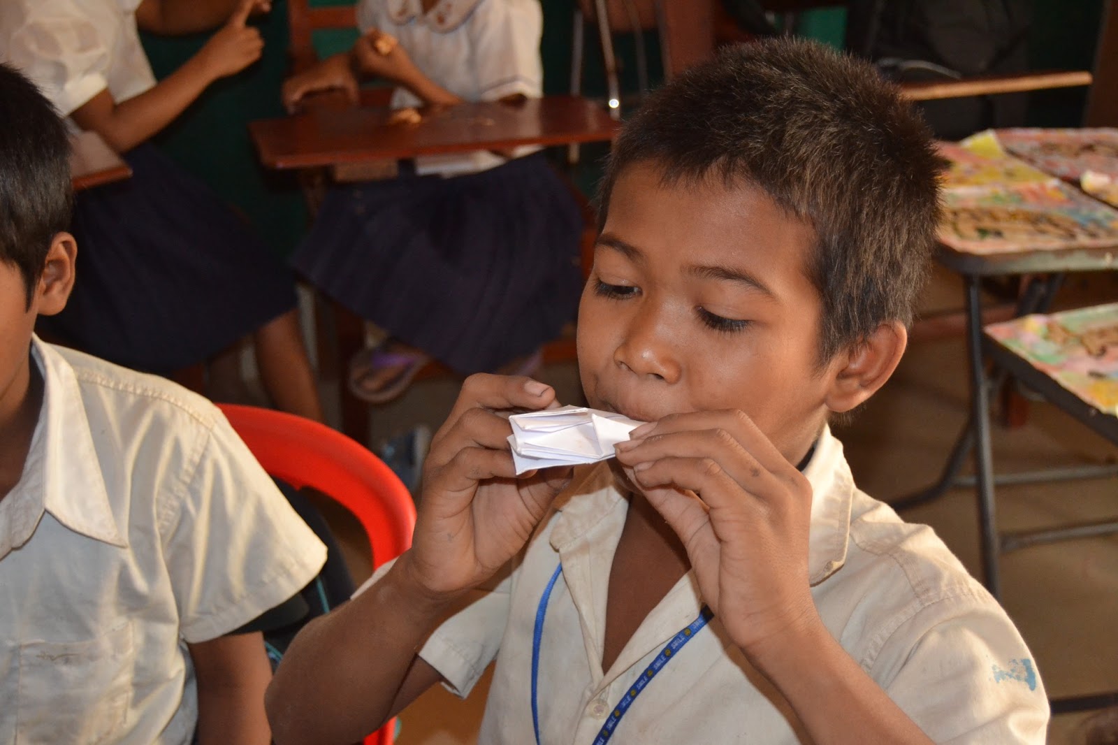 Also, we had some visitors over at the school today. Three young tourists from the guesthouse (a Dutch couple and a French guy) asked of they could join our class and the Dutch couple and I agreed that they even took over part of the class. So, they tought them how to make their own ballons that they can blow up out of a piece of paper. Both, the kids and the guests enjoeyed the visit very very much.